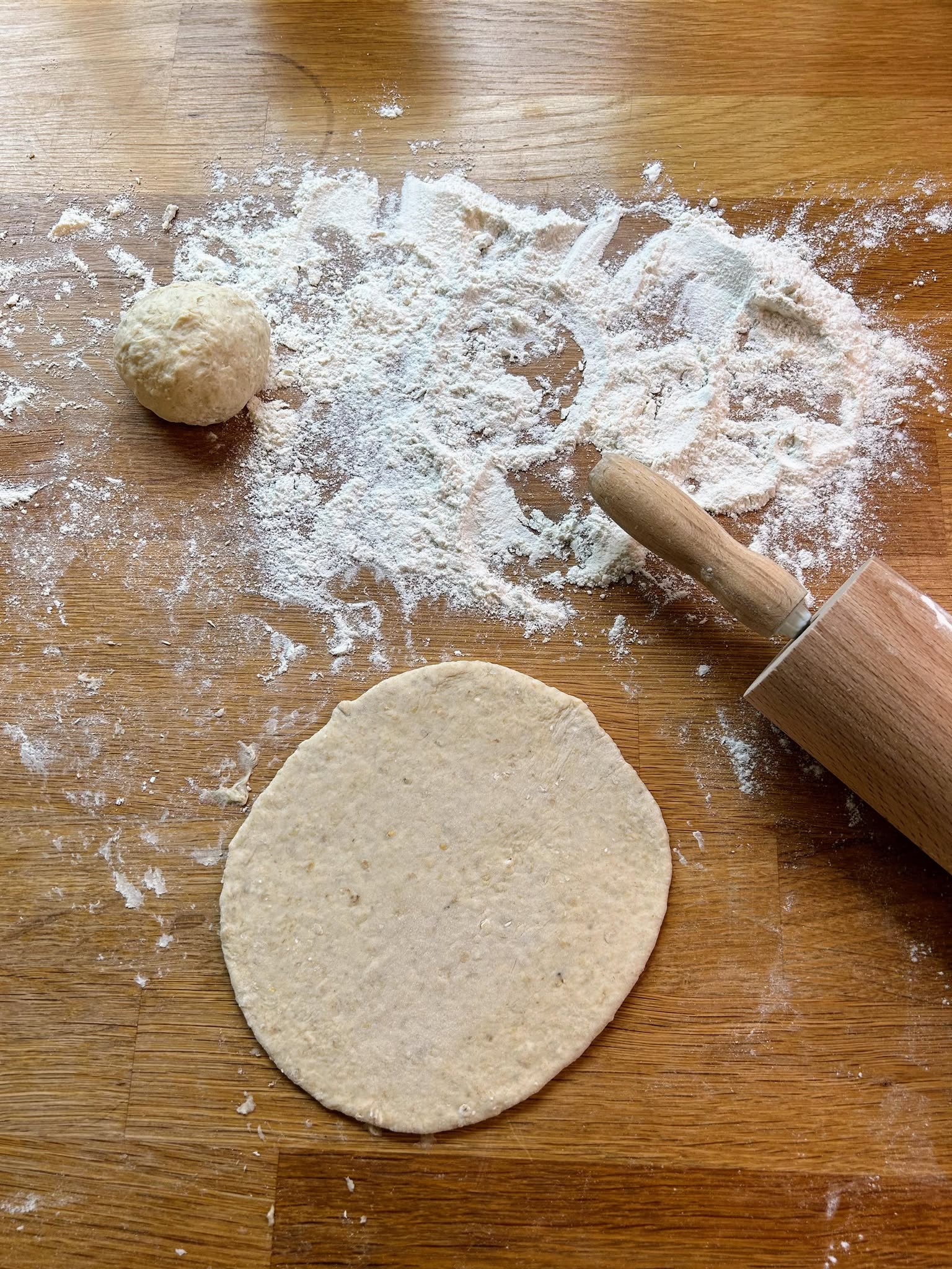 Trill ut rundstykker, en god håndfull størrelse. Kjevle de til runde små tallerken størrelser, maks en ½ cm tykke. Jeg pleier å gjøre ferdig 2 stk og så begynne å steke, så kjevler jeg flere etter hvert når brødene steker i pannen.
