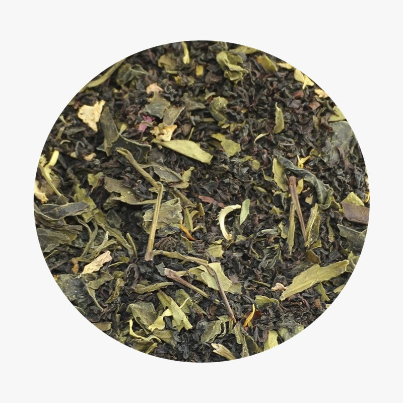 Sort økologisk Ceylon Pekoe te (80 %), hvit økologisk Ceylon te (14 %), naturlig aroma av mango og bergamot, økologiske roseblader, økologiske ringblomster.
