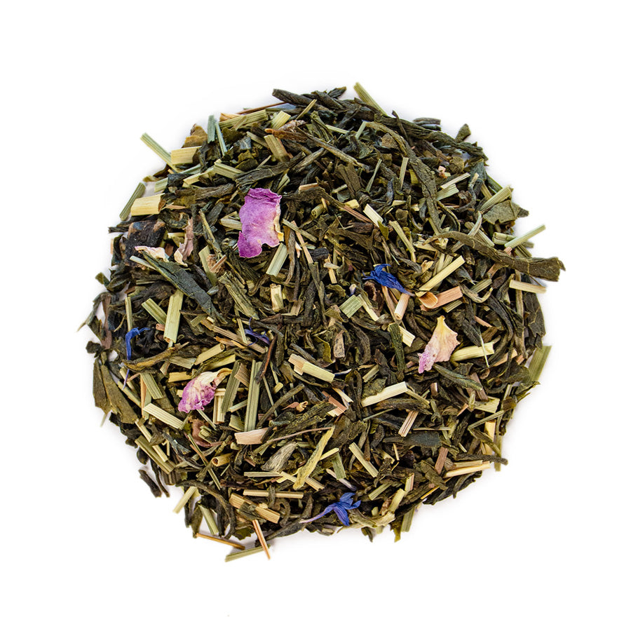 72 % hvit og grønn te, sitrongress, johannesbrødkjerner, sitronbiter, rosenblader, kornblomstblader, bergamot- og sitronaroma. 100 % økologisk.