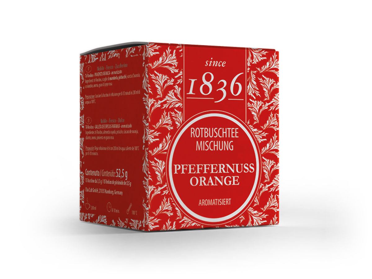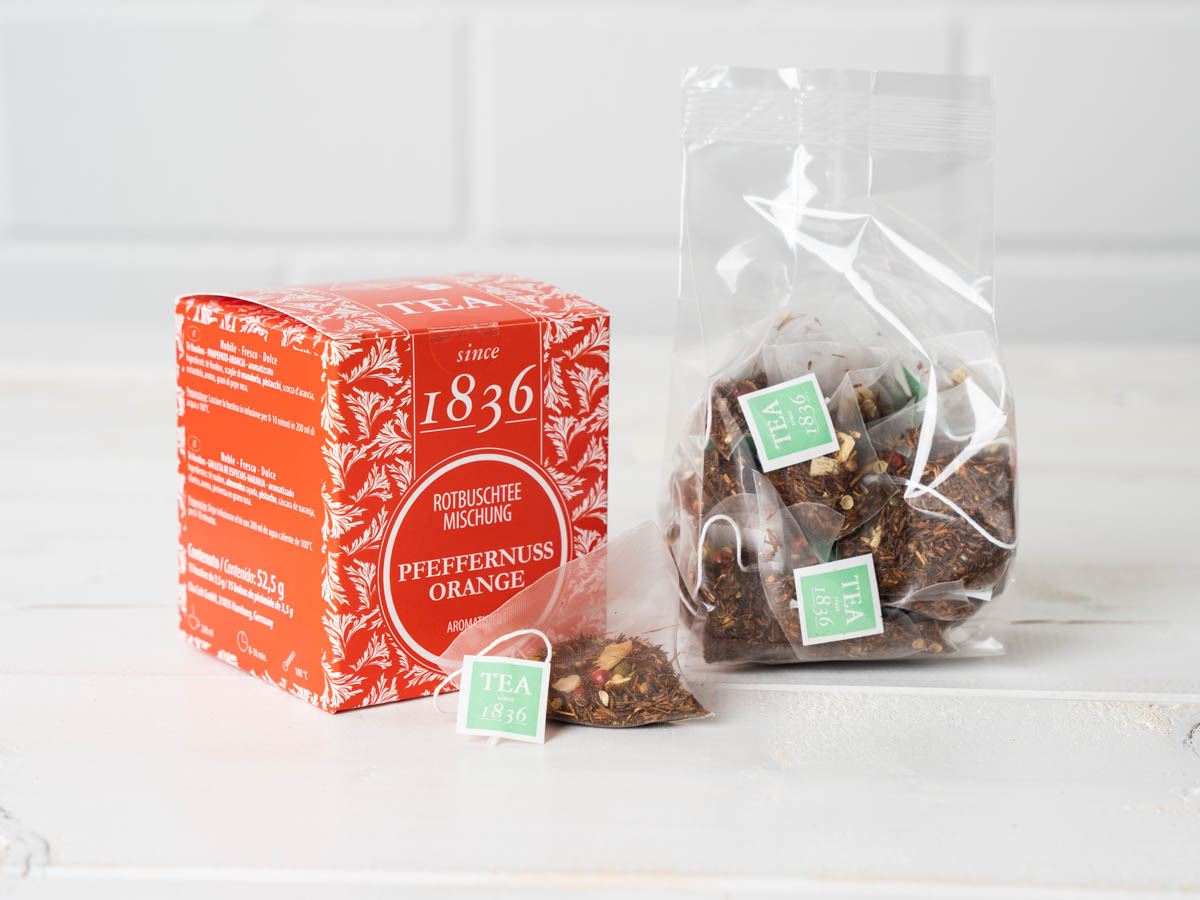 Koffeinfri rooibosblanding med pepperkakesmak, mandel og frisk appelsin – varm, krydret og perfekt til julens kosestunder.